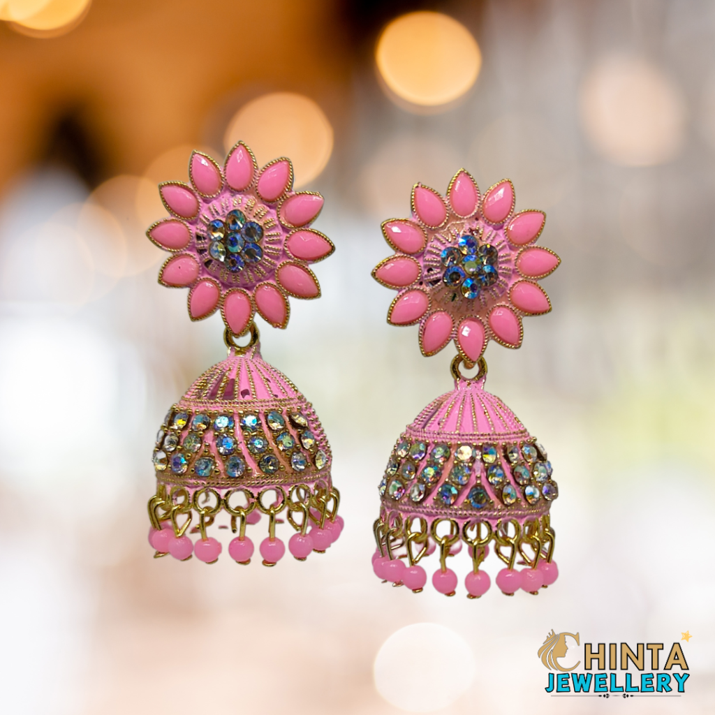 Pink Floral Jhumka Earrings with Crystal Accents – Chinta Jewellery Store